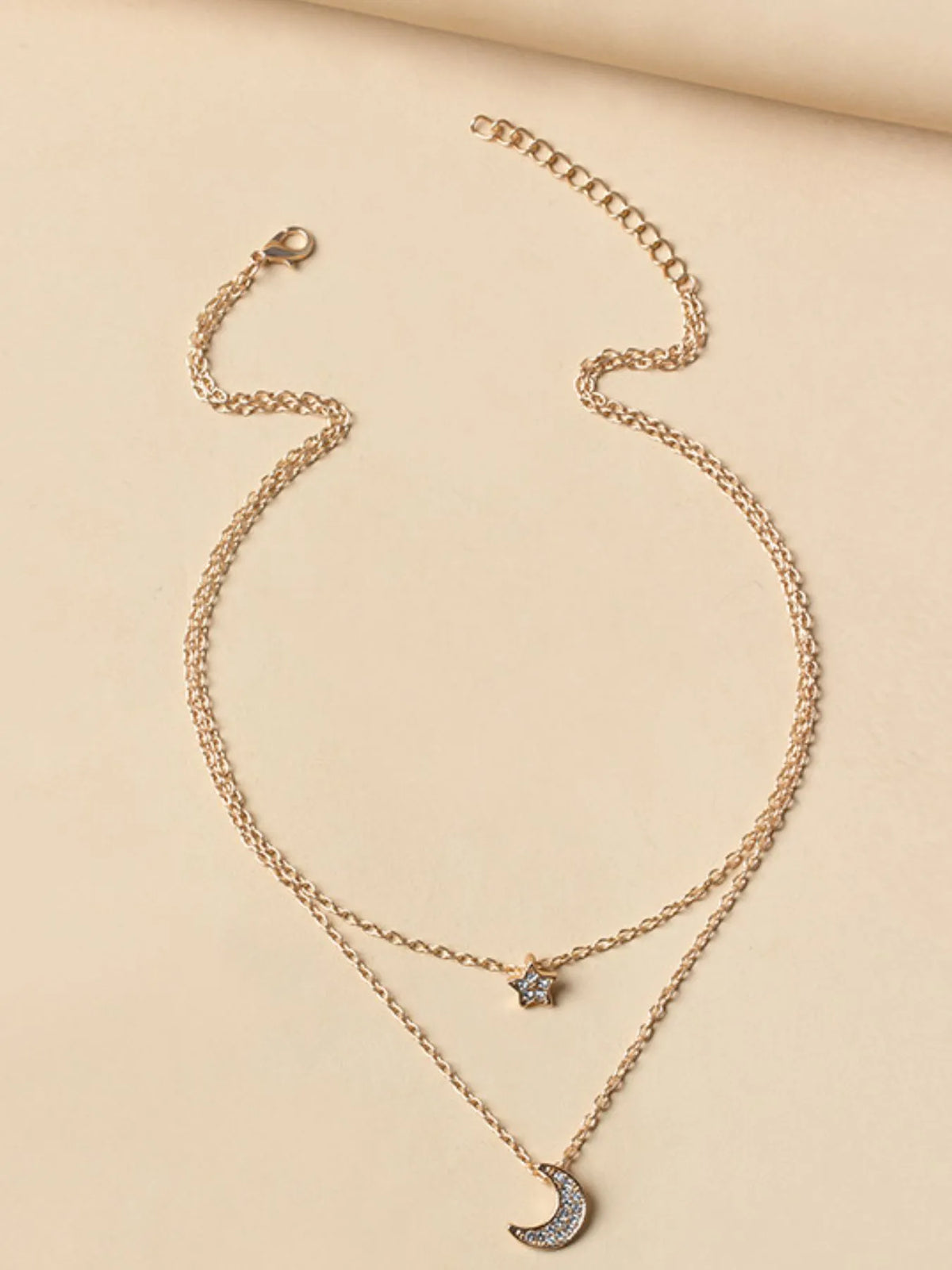 Double Layered Star and Moon Pendant Necklace - Gold / One Size
