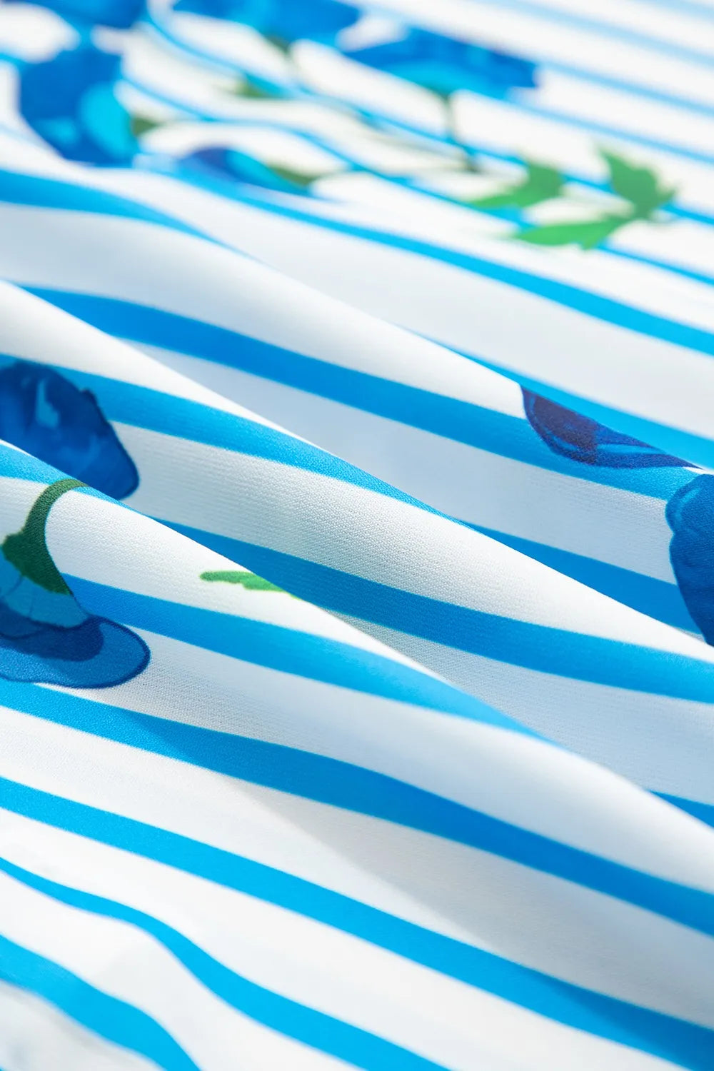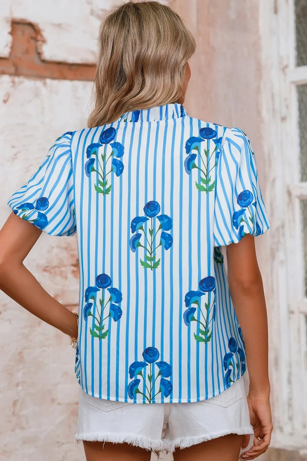 Stripe Floral Notched Neck Puff Sleeve Summer Blouse - Pastel Blue / S