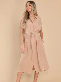 Drawstring Collared Neck Short Sleeve Midi Dress